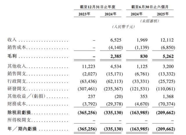 2023年、2024年和2025年上半年(下称:报告期内),礼邦医药收入分别约为0元、652.5万元、1211.2万元;期内亏损分别为3.65亿元、3.35亿元和2.10亿元,两年半亏损9.1亿元;毛利率分别为0、36.6%及43.4%。