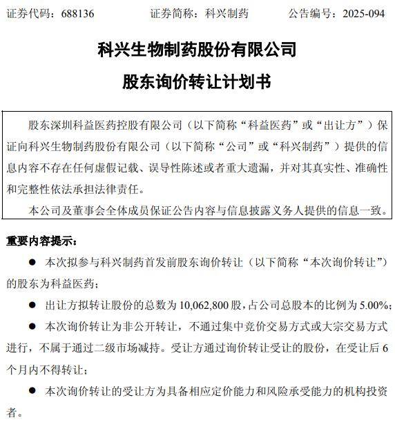 近日,科兴制药(688136)发布公告,股东深圳科益医药控股有限公司拟转让股份1006万股,占公司总股本的5.00%,转让原因为自身经营发展需要,受让方为具备相应定价能力和风险承受能力的机构投资者。