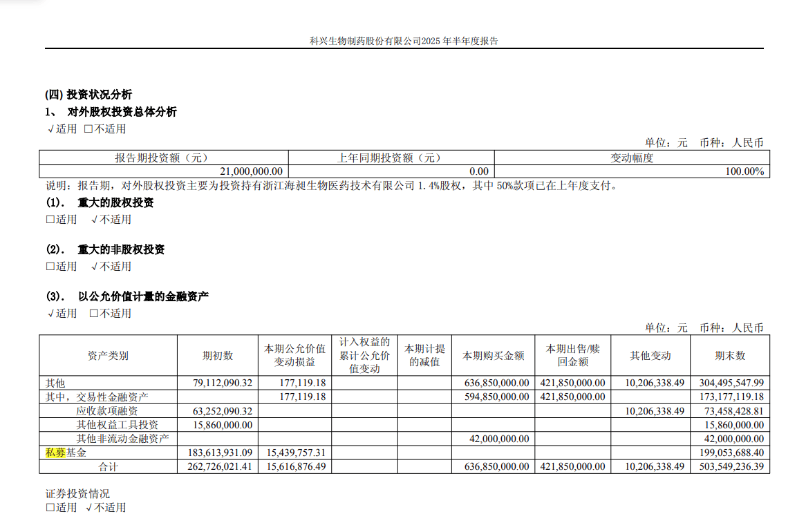 公允价值变动方面,根据2025年中报披露,科兴制药期末拥有的“以公允价值计量的金融资产”共5.04亿元。其中,私募基金期末金额为1.99亿元,报告期内公允价值变动损益为1544万元。