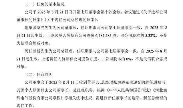 值得注意的是,今年8月,旭辉电气发布公告,公司董事会于2025年8月11日收到董事长、总经理张旭辉递交的辞任通知书,其因个人原因辞去公司董事长、总经理职务,