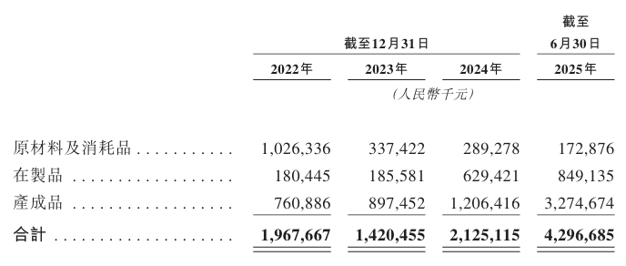 海辰储能2022年至2025年上半年存货余额明细(千元)