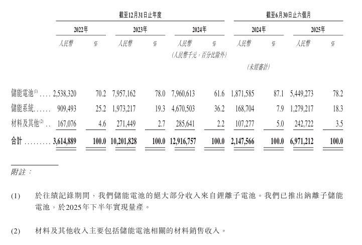 从业务结构来看,储能电池是海辰储能的绝对主力。2025年上半年,公司储能电池收入达54.49亿元,占总收入的78.2%;储能系统收入12.79亿元,占比18.3%;材料及其他收入占剩余的3.5%。