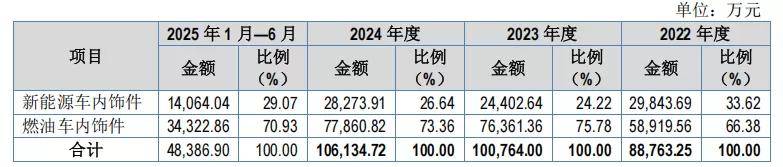 数据显示,报告期各期,公司燃油车内饰件产品占主营业务收入的比例分别为66.38%、75.78%、73.36%、70.93%。相比之下,新能源车内饰件产品收入占比较低,分别为33.62%、24.22%、26.64%、29.07%。