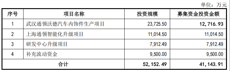 在通领科技上市招股书申报稿当中,拟募集资金为5.16亿元,其中0.95亿元用于补充流动资金,0.69亿元用于上海通领汽车门板总成生产项目,0.79亿元用于研发中心升级项目,1.10亿元用于上海通领智能化升级项目,1.62亿元用于武汉通领沃德汽车内饰件生产项目。