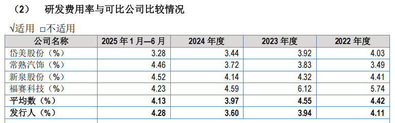 报告期内,通领科技研发费用分别为3667.58万元、3993.97万元、3834.49万元、2078.09万元,占营业收入的比例分别为4.11%、3.94%、3.60%、4.28%;研发费用率分别为4.11%、3.94%、3.60%、4.28%,多个财年低于行业平均水平,这也引发外界对其新能源投入与可持续性的质疑。