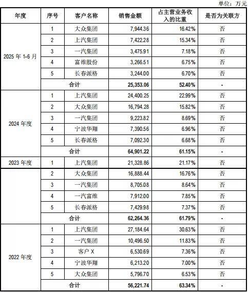 通领科技的业务结构还存在明显风险点。公司前五大客户销售收入占比居高不下,2022年至2025年上半年分别为63.34%、61.79%、61.15%、52.40%。