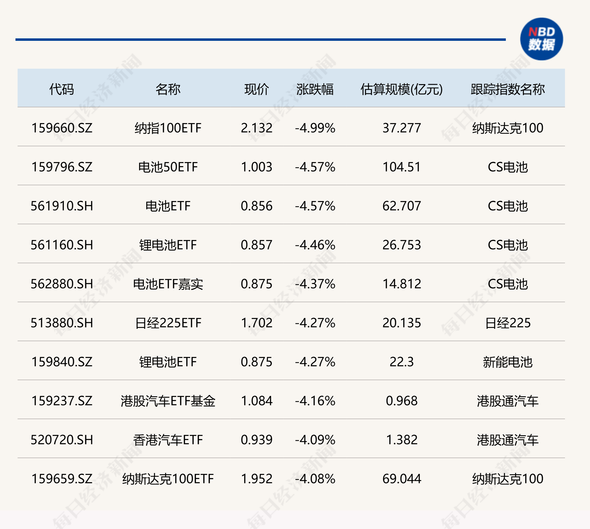 下跌方面,纳指、电池相关ETF跌超4%。