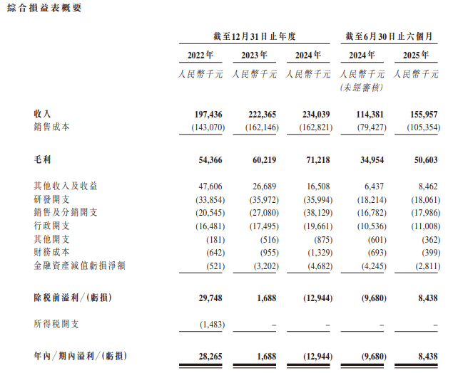 财务方面,招股书显示,于2022年、2023年、2024年和2025年前六个月,卡诺普机器人的营业收入分别为人民币1.97亿元、2.22亿元、2.34亿元、1.56亿元,相应期间的净利润分别为人民币2,826.5万元、168.8万元、-1,294.4万元、843.8万元。同期,公司毛利分别为5436.6万元、6021.9万元、7121.8万元、5060.3万元人民币。