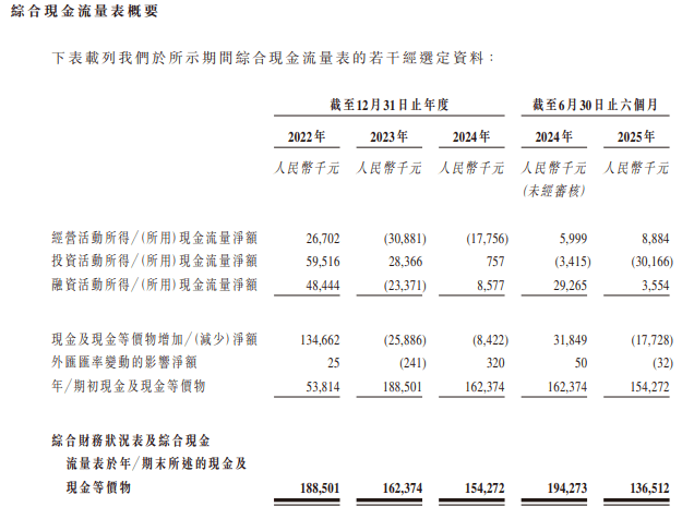 招股书显示,2023-2024年,公司经营活动现金流连续为负,分别净流出3088万元、1776万元,2025年上半年虽转正至888万元,但公司现金及现金等价物(1.37亿元)则较2024年底(1.54亿元)减少11.5%。