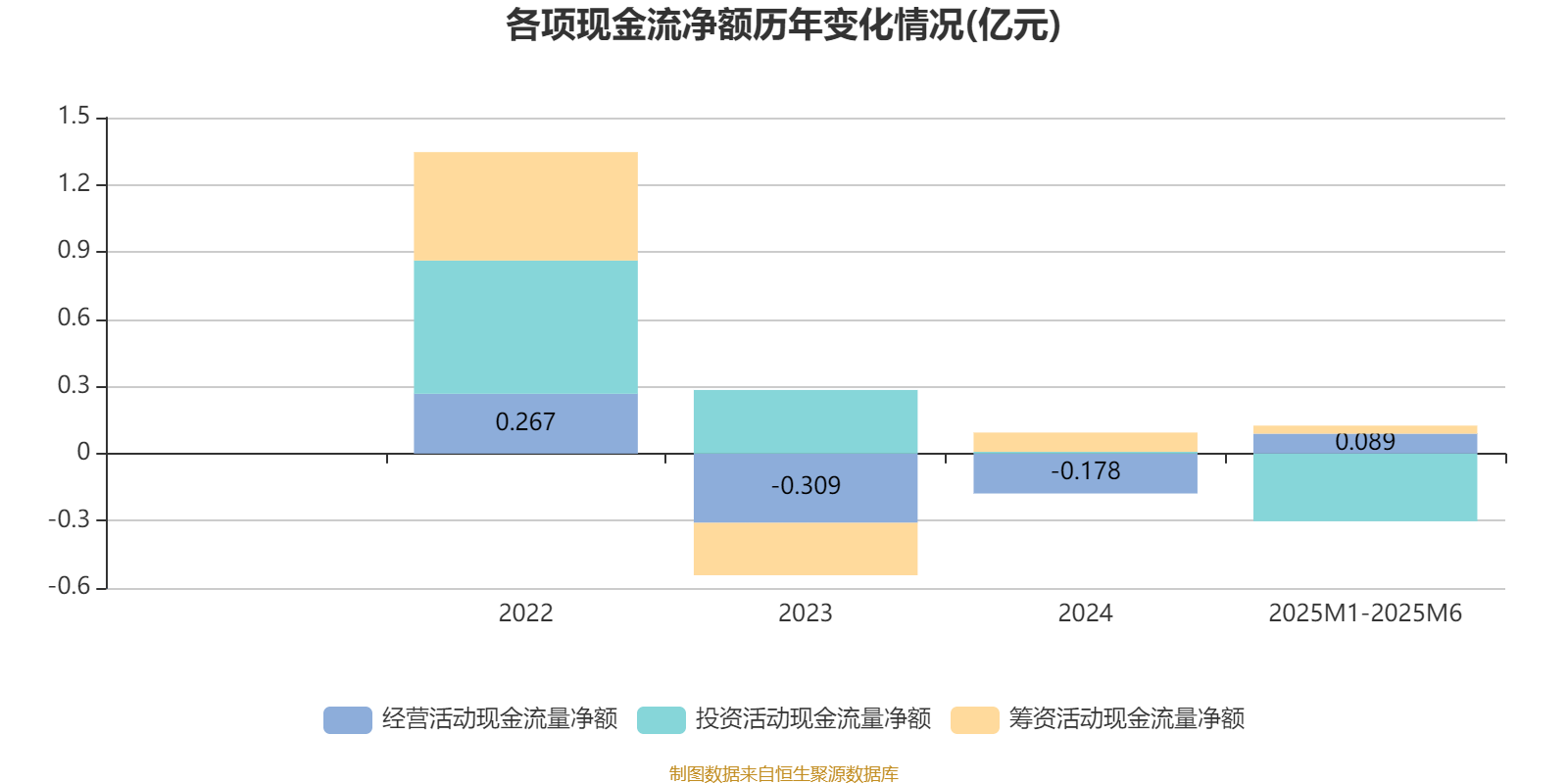 2025年1月至6月,公司经营活动现金流净额为888.4万元,同比增长48.09%;筹资活动现金流净额355.4万元,同比减少2571.1万元;投资活动现金流净额-3016.6万元,上年同期为-341.5万元。