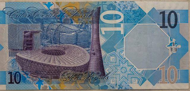 这是2025年4月17日在卡塔尔首都多哈以卢赛尔体育场为背景拍摄的卡塔尔10里亚尔纸币,纸币左边图案为卢赛尔体育场。
