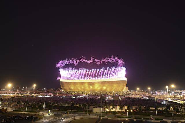 这是2024年1月12日在卡塔尔首都多哈拍摄的举行卡塔尔亚洲杯开幕式焰火表演的卢赛尔体育场。
