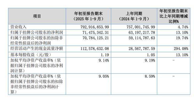2025年前三季度,帅特龙营业收入为7.93亿元,同比增长4.74%;归母净利润为7147.53万元,同比增长13.1%。