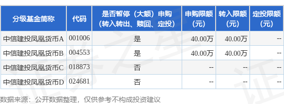 注:本公告就通过代销渠道办理中信建投凤凰货币市场基金的大额申购(含大额定期定额投资)、大额转换转入业务进行限制,即自2025年11月20日起单日每个基金账户通过代销渠道单笔或累计申购(含定期定额投资)、转换转入中信建投凤凰货币A或中信建投凤凰货币B的金额调整为均不应超过40万元。单日每个基金账户通过代销渠道单笔或累计申购(含定期定额投资)、转换转入中信建投凤凰货币A或中信建投凤凰货币B的金额超过40万元(不含),基金管理人有权全部或部分拒绝,但基金管理人认为相关申请不会影响基金平稳运作的除外。本基金A类和B类份额恢复代销渠道正常办理大额申购(含大额定期定额投资)、大额转换转入业务,基金管理人将另行公告。