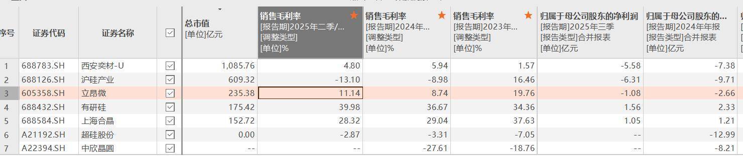 截至2025年前三季度,沪硅产业、西安奕材、立昂微分别亏损6.31亿元、5.58亿元、1.08亿元。毛利率方面,2025年前三季度,沪硅产业为-13%、西安奕材为4.8%,立昂微为11.14%,上海合晶、有研硅毛利率分别为28.32%、39.98%。