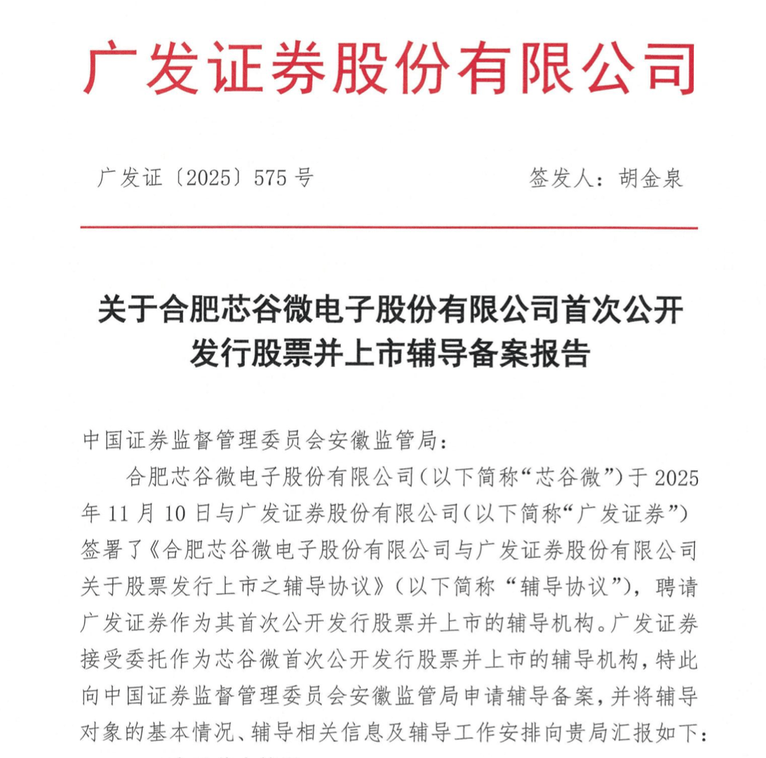 11月18日,中国证监会官网公开发行辅导公告显示,合肥芯谷微电子股份有限公司在安徽证监局办理辅导备案登记,辅导机构为广发证券。这是芯谷微电子自2024年4月主动撤回科创板IPO申请后,再次提交辅导备案。