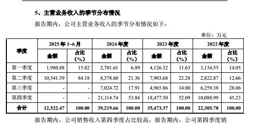 2022年-2024年,公司营业收入分别为22321.7万元、35486.5万元、39242.06万元,净利润分别为510.42万元、5776.48万元、8451.53万元,业绩呈现稳步增长态势。但收入结构存在明显的季节性差异,报告期内每年第四季度销售收入占比持续攀升,分别为10088.99万元、18477.5万元、21114.74万元,占当期主营业务收入的比例依次达到45.23%、52.09%、53.84%,2023年和2024年更是有超过一半的收入来自第四季度。