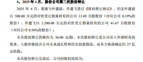 除机构股东外,实控人郭寅也在IPO前夕进行了套现操作。2025年4月,郭寅与叶建毅、许建飞签订《股份转让协议》:叶建毅以500万元对价受让郭寅持有的13.89万股股份(对应公司0.19%股权),许建飞以1500万元对价受让41.67万股股份(对应公司0.56%股权),通过这两笔交易,郭寅合计套现2000万元。