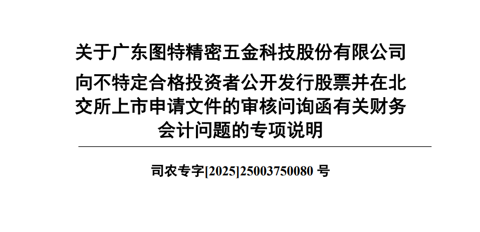 广东图特精密五金科技股份有限公司(下称“图特股份”)在终止主板IPO后转战北交所,2024年登陆新三板,今年7月获北交所受理,并于11月披露首轮问询回复,此时距离收到问询函已经过去三个多月。在7月25日的问询函中,监管一连提出了10大问题,关注点涉及股权结构、成本费用变化和研发投入,也要求公司解释与大客户合作的商业逻辑与独立性。