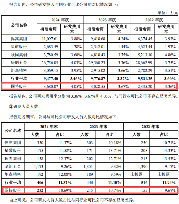 再看公司自身披露的数据。招股书显示,2022-2024年图特股份的研发费用分别为2335万元、3029万元和3680万元,对应研发费用率为3.36%、3.67%和4.05%。也就是说,除了2024年之外,在营收已经站上6亿元以上、稳居“>2亿元”档位的前提下,公司研发强度整体略高于高新技术企业3%的最低门槛,但与不少专精特新“小巨人”企业4%–5%甚至更高的普遍水平相比,并不突出。