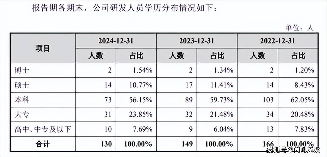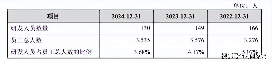 研发投入的收缩还体现在人员配置上。2022年至2024年,公司研发人员数量从166人减少到149人,再降至130人。
