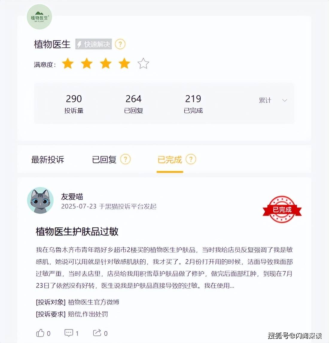 2022年,植物医生“紫灵芝多效驻颜洁面乳”被检出菌落总数超标21倍,涉事批次产品被责令下架,但通报后数日仍在电商平台销售。截至目前,植物医生在黑猫投诉 【下载黑猫投诉客户端】平台上的投诉总量已达到290条,主要涉及产品安全与诱导消费问题。