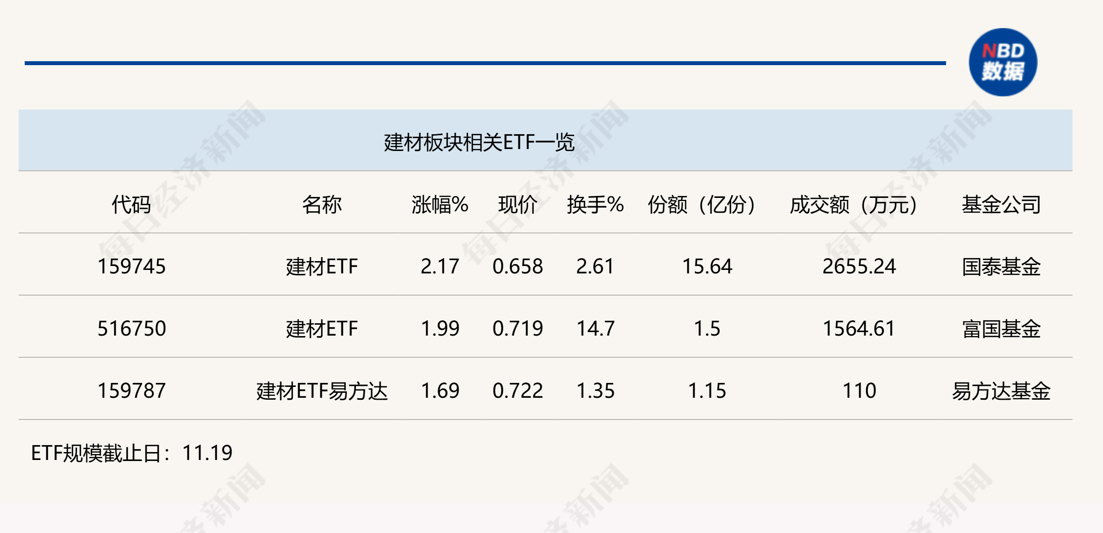 点评:建材ETF(159745)今日上午涨幅为2.17%,其份额为15.64亿份,半日成交金额为2655.24万元,该ETF追踪的是中证全指建筑材料指数。追踪该指数的ETF还包括建材ETF(516750)和建材ETF易方达(159787)。