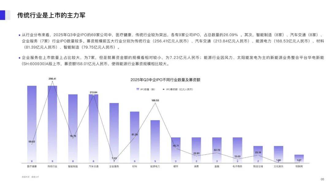 从行业分布来看,2025年Q3中企IPO的69家公司中,医疗健康、传统行业较为突出,各有9家公司IPO,占总数量的26.09% 。其次,智能制造(8家)、汽车交通(8家)、企业服务(7家)行业IPO数量较多。募资规模前五大行业分别为传统行业(256.41亿元人民币)、汽车交通(213.84亿元人民币)、能源电力(188.53亿元人民币)、材料(81.39亿元人民币)、智能制造(79.75亿元人民币)。