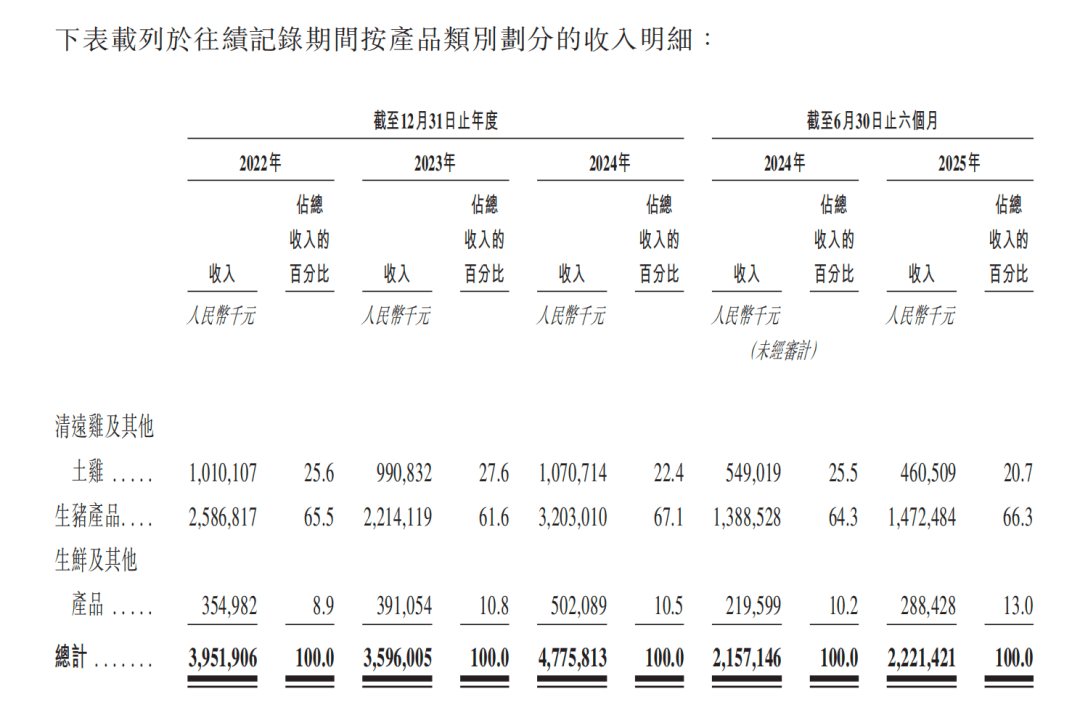 虽然“清远鸡王”金字招牌名扬四方,但随着生猪业务快速起量,已成为公司收入第一大来源:2024年以营收计位列中国西南部第八,单头生猪毛利跻身全国规模化养殖企业第二。从2022年至2024年,生猪产品贡献的收入占比分别为65.5%、61.6%和67.1%。2025年上半年占比达66.3%。