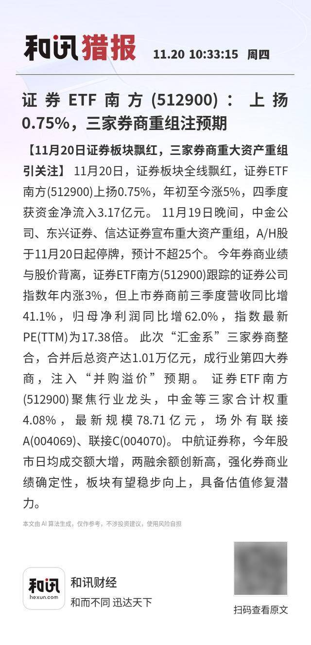【11月20日证券板块飘红,三家券商重大资产重组引关注】11月20日,证券板块全线飘红,证券ETF南方(512900)上扬0.75%,年初至今涨5%,四季度获资金净流入3.17亿元。11月19日晚间,中金公司、东兴证券、信达证券宣布重大资产重组,A/H股于11月20日起停牌,预计不超25个。今年券商业绩与股价背离,证券ETF南方(512900)跟踪的证券公司指数年内涨3%,但上市券商前三季度营收同比增41.1%,归母净利润同比增62.0%,指数最新PE(TTM)为17.38倍。此次“汇金系”三家券商整合,合并后总资产达1.01万亿元,成行业第四大券商,注入“并购溢价”预期。证券ETF南方(512900)聚焦行业龙头,中金等三家合计权重4.08%,最新规模78.71亿元,场外有联接A(004069)、联接C(004070)。中航证券称,今年股市日均成交额大增,两融余额创新高,强化券商业绩确定性,板块有望稳步向上,具备估值修复潜力。