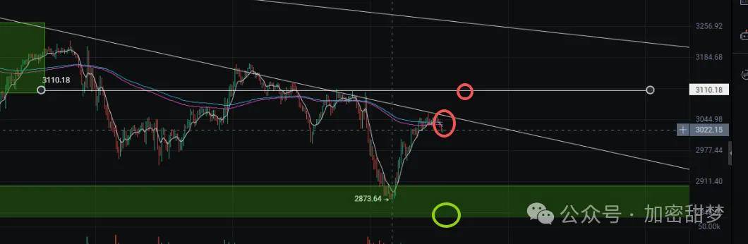 短线上eth的点位逻辑是,跌破3050后低点打到2880-2800时,3050就基本成为反弹的最高点。如果回踩的低点在2926-2960,那么反弹的高点可以往上推进到3072-3112。空头的防守只需要3150。所以低多和高空的盈亏比都还是较大的。