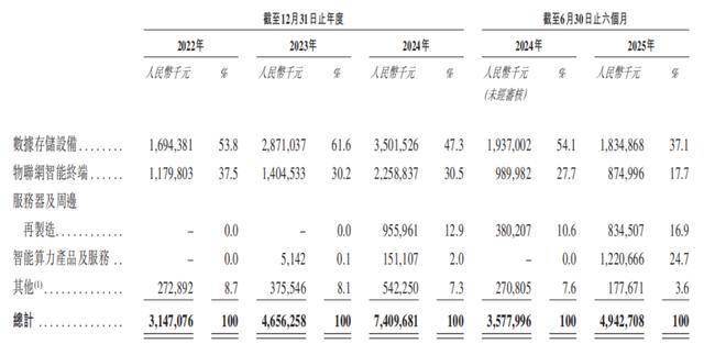 不过,由于战略重心的转移,协创数据原两大支柱性业务数据存储设备、物联网智能终端收入出现下滑。2025年上半年,该两大业务收入分别为18.35亿元、8.75亿元,同比分别减少1.02亿元、1.15亿元,降幅5.27%、11.61%,收入占比也分别由2022年的53.8%、37.5%降至2025年上半年的37.1%、17.7%。