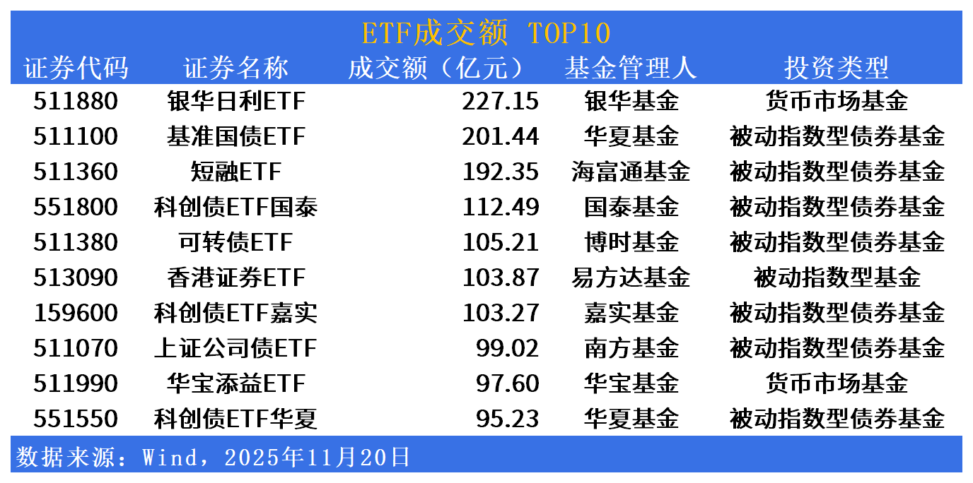成交额方面,银华日利ETF(511880)今日成交额居首,达227亿元;基准国债ETF(511100)、短融ETF(511360)、科创债ETF国泰(551800)成交额紧随其后。