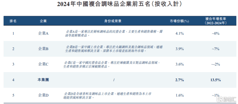 按收入来算,2024年前五大企业的市场份额合计为15.9%,其中,天味食品以2.7%的市场份额位列中国复合调味品企业第四位。