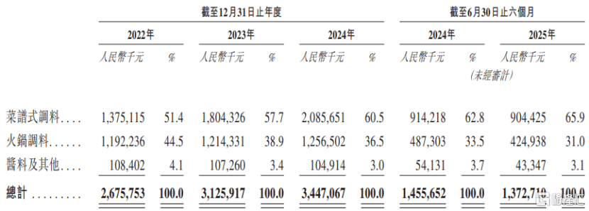 具体来看,2022年至2025年上半年(简称“报告期”),菜谱式调料产品为公司贡献了50%以上的收入;火锅调料产品的收入占比有所下降,但仍超过30%;酱料及其他产品收入占比较低。