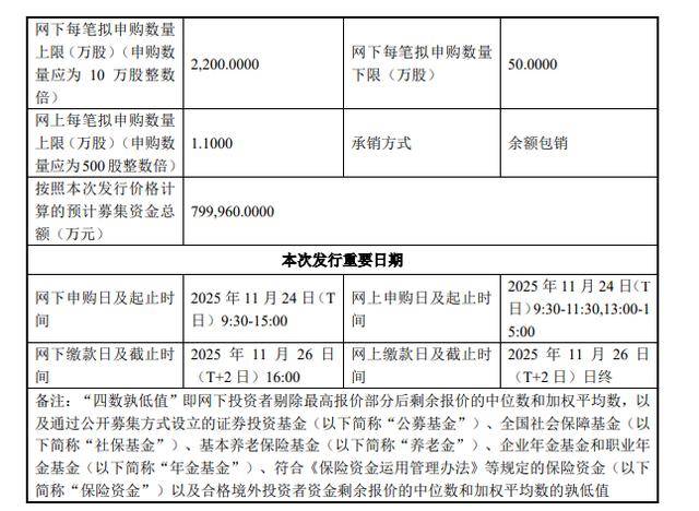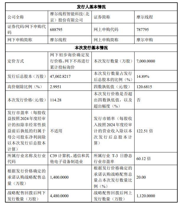 11月20日,摩尔线程(688795.SH)公告,本次发行股份数量为7000万股,全部为公开发行新股。本次网上发行与网下发行将于2025年11月24日(T日)分别通过上交所交易系统和互联网交易平台实施。发行价格为114.28元/股。本次募投项目预计使用募集资金为80亿元,按本次发行价格114.28元/股和7000万股的新股发行数量计算,预计发行人募集资金总额为79.996亿元,扣除发行费用,预计募集资金净额为75.76亿元。同时,摩尔线程发布本次发行最终战略配售数量结果,包括中证投资,中信证券资管摩尔线程员工参与科创板战略配售1号集合资产管理计划,天翼资本控股有限公司等获配。