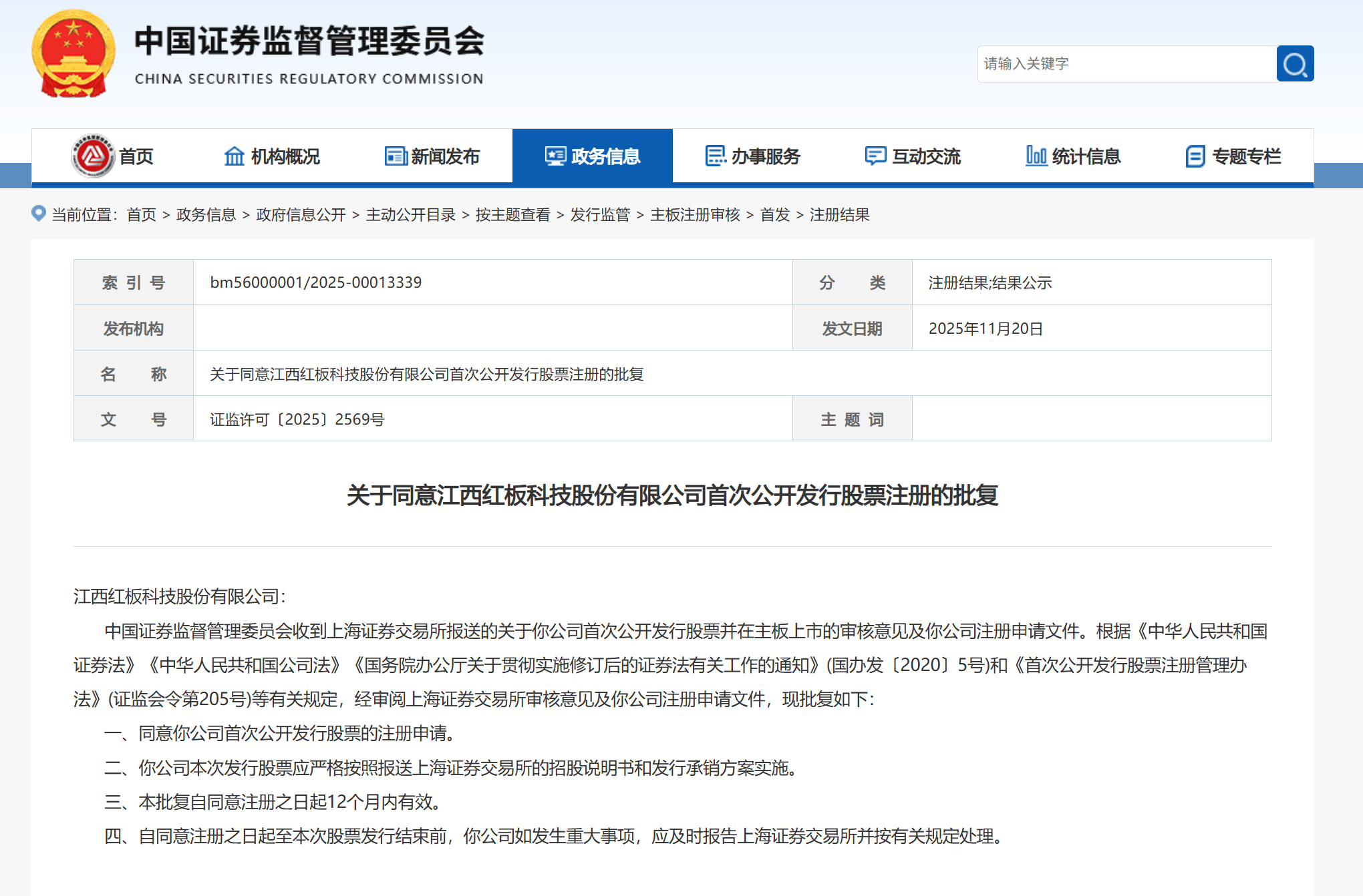 11月20日,中国证监会发布《关于同意江西红板科技股份有限公司首次公开发行股票注册的批复》。据悉,江西红板科技股份有限公司(下称“红板科技”)拟在上交所主板上市。