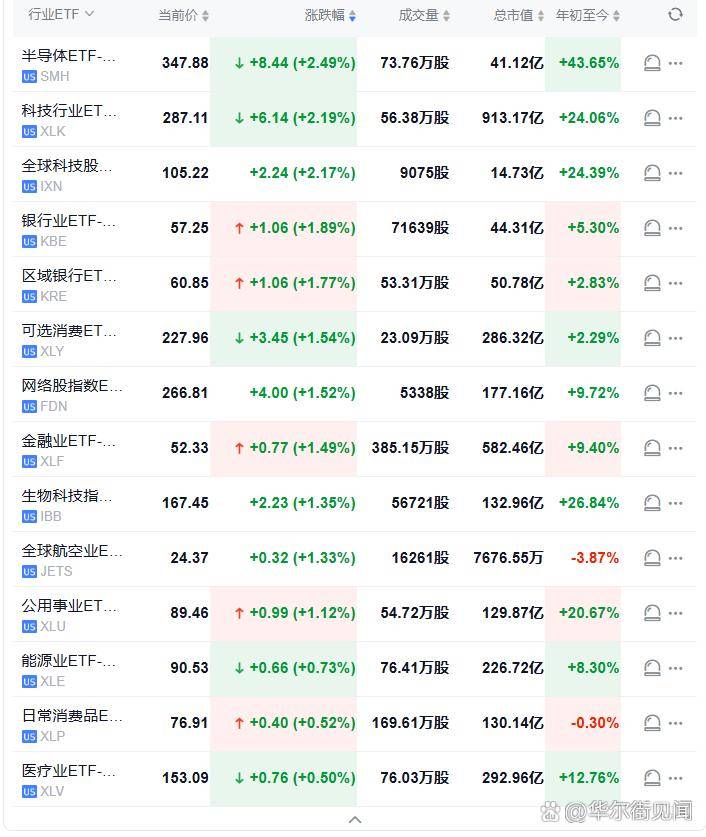 行业ETF美股盘初普遍上涨,半导体ETF涨2.49%,科技行业ETF涨2.19%,全球科技股指数ETF涨2.17%,银行业ETF涨1.89%,可选消费ETF、网络股指数ETF涨超1.50%,能源业ETF涨0.73%。