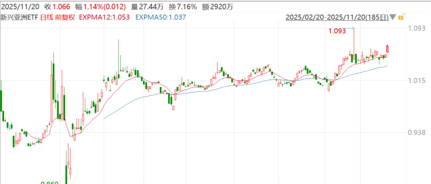 11月20日,印度SENSEX30指数涨0.33%,创2024年9月以来新高,距历史高位仅一步之遥。信实工业、马衡达信息技术、印度国家电网等涨超1%。新兴亚洲ETF(520580)收涨1.14%,报收1.066元,创今年2月20日上市以来最高收盘价。