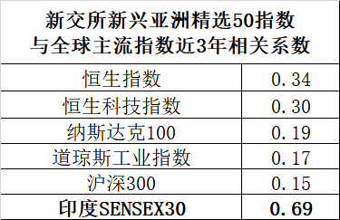 从全球各主要指数相关系数看,新交所新兴亚洲精选50指数与印度市场相关度高,根据统计,截至11月19日,该指数与印度Sensex30指数近三年相关系数达0.69,与恒生指数、沪深300指数、纳斯达克100指数相关数分别为0.3、0.15、0.19,为全球多元化配置提供了新标杆。