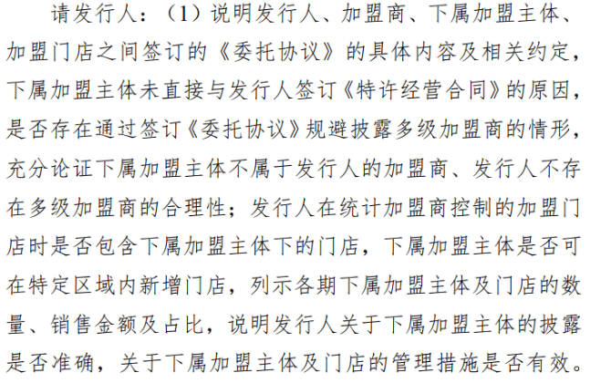在前次问询答复中,一种被称为“下属加盟主体”的模式浮出水面,该模式由加盟商代理其他自然人签署《特许经营合同》,仍在授权区域内开设加盟门店,但门店实际控制人为前述自然人。监管在首轮问询中曾要求公司说明下属加盟主体相关加盟模式的合理性、是否符合行业惯例。
