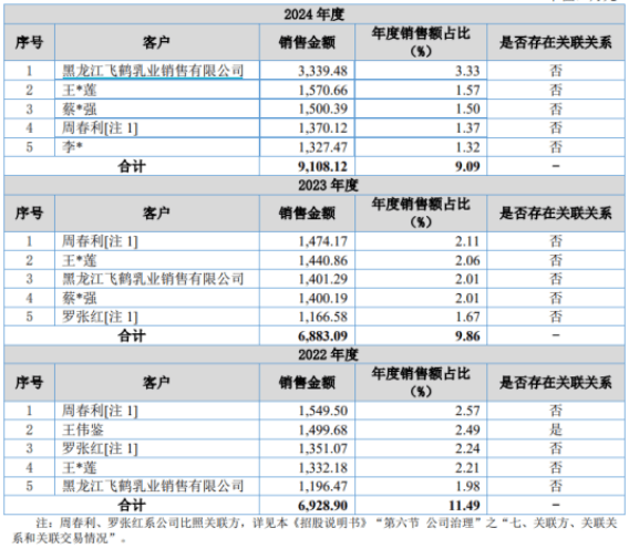 彼时公司回复称,公司的少量加盟门店由加盟商的亲属、朋友等控制,公司将相关门店的实际控制人称为“下属加盟主体”。招股书显示,公司客户结构中,关联方的身影尤为醒目。实控人江大兵的亲属周春利在2022年及2023年均为公司第一大客户,直至2024年才降至第四位;另一亲属罗张红也常年位列公司前五大客户。