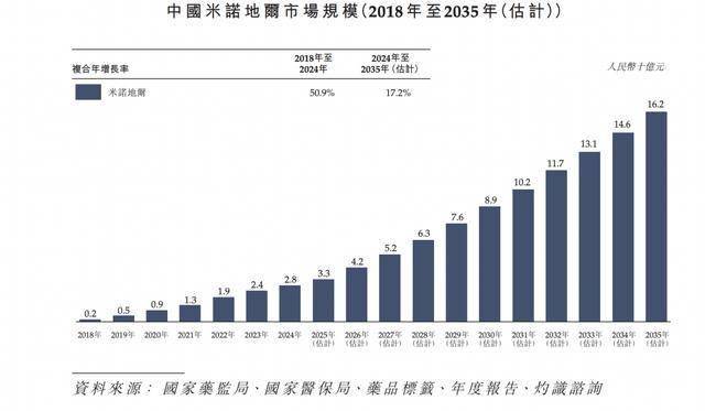 米诺地尔是最常用的头发健康管理外用药物。经过广泛的临床验证,米诺地尔因其经过验证的功效及良好的安全性而广受认可。随着市场意识及消费者教育程度的不断提高,米诺地尔的市场扩张将加速。在中国,米诺地尔市场规模由2018年的2亿元强劲增长至2024年的28亿元,复合年增长率为50.9%,预计2035年将进一步增至162亿元,2024年至2035年的复合年增长率为17.2%。
