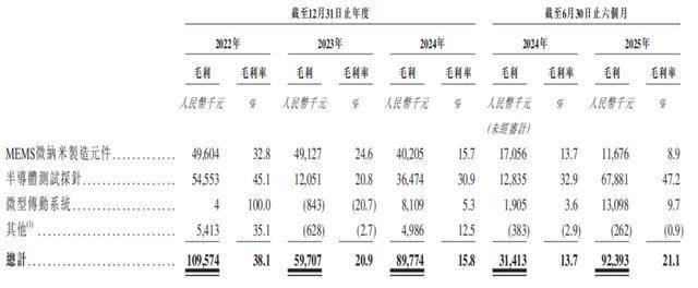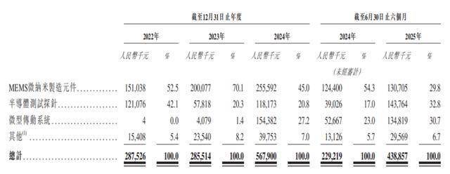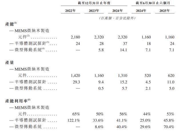 2025年上半年,公司MEMS微纳米制造元件、半导体测试探针、微型传动系统三大业务的产能利用率分别仅有53%、45.8%及70.4%。