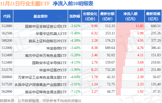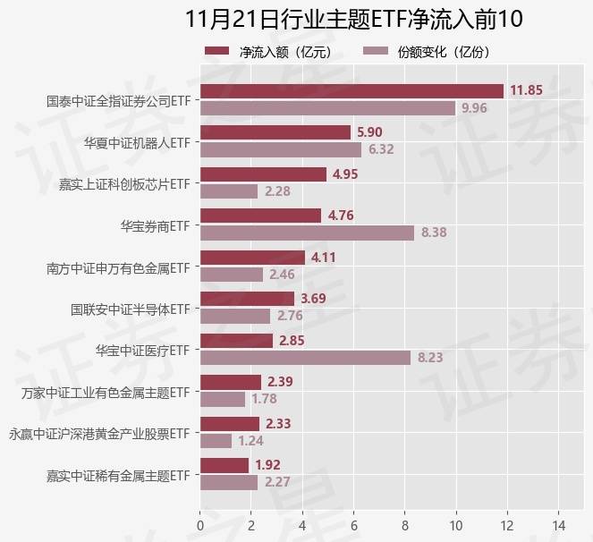当日有146只行业主题ETF基金出现资金净流入,其中净流入排首位的是国泰中证全指证券公司ETF(512880),份额增加了9.96亿份,净流入额为11.85亿元。