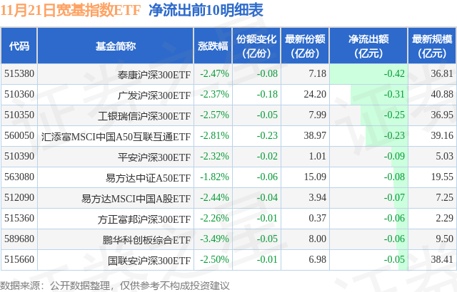 当日有29只宽基指数ETF基金出现资金净流出,其中净流出排首位的是泰康沪深300ETF(515380),份额减少了810.0万份,净流出额为4173.66万元。