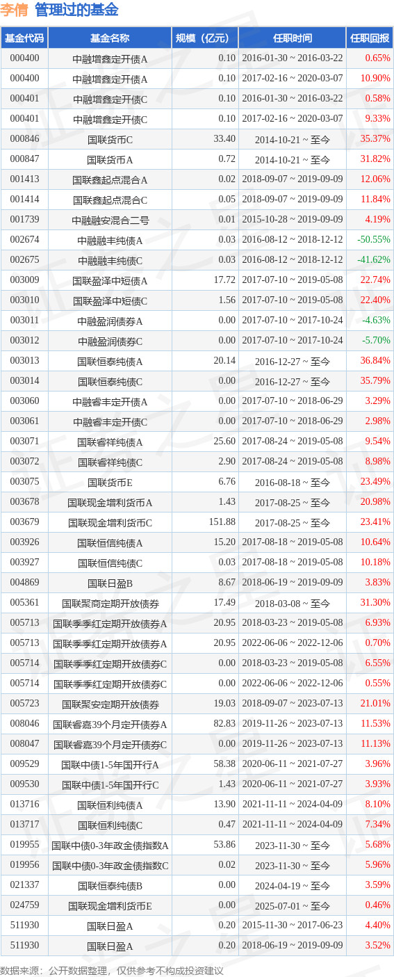李倩女士:中国国籍,毕业于对外经济贸易大学金融学专业,硕士学位,具有基金从业资格。2007年7月至2014年7月曾任银华基金管理有限公司交易管理部交易员,固定收益部基金经理助理。2014年7月加入国联基金管理有限公司,任固收投资部基金经理。现任国联恒泰纯债债券型证券投资基金(2016年12月起至今)、国联货币市场基金(2014年10月起至今)、中融融安二号灵活配置混合型证券投资基金(2015年10月至2019年09月)、国联日日盈交易型货币市场基金(2015年11月至2017年06月)(2018年06月至2019年09月)、中融融丰纯债债券型证券投资基金(2016年08月至2019年03月)、中融增鑫一年定期开放债券型证券投资基金(2017年02月至2020年04月)、中融盈润债券型证券投资基金(2017年07月至2017年10月)、中融睿丰一年定期开放债券型证券投资基金(2017年07月至2018年06月)、国联盈泽中短债债券型证券投资基金(2017年07月至2019年05月)、国联恒信纯债债券型证券投资基金(2017年08月至2019年05月)、国联睿祥纯债债券型证券投资基金(2017年08月至2019年05月)、国联现金增利货币市场基金(2017年08月起至今)、国联聚商3个月定期开放债券型发起式证券投资基金(2018年03月起至今)、国联季季红定期开放债券型证券投资基金(2018年03月至2019年05月)、国联聚安3个月定期开放债券型发起式证券投资基金(2018年09月至2023年07月)、国联鑫起点灵活配置混合型证券投资基金(2018年09月至2019年09月)、国联睿嘉39个月定期开放债券型证券投资基金(2019年11月至2023年07月)、国联中债1-5年国开行债券指数证券投资基金(2020年06月至2021年07月)、国联恒利纯债债券型证券投资基金(2021年11月至2024年04月)、国联中债0-3年政策性金融债指数基金(2023年11月起至今)的基金经理。