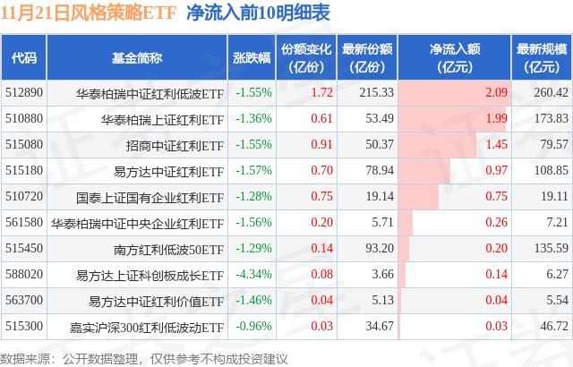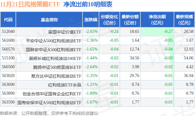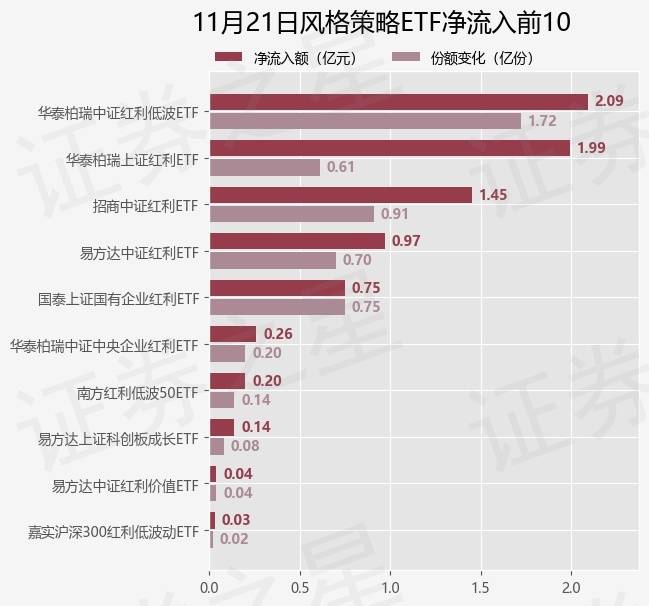 当日有14只风格策略ETF基金出现资金净流入,其中净流入排首位的是华泰柏瑞中证红利低波ETF(512890),份额增加了1.72亿份,净流入额为2.09亿元。
