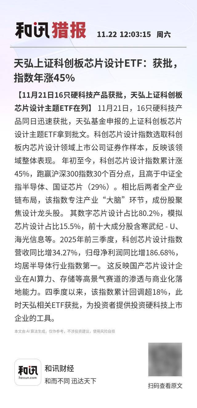 【11月21日16只硬科技产品获批,天弘上证科创板芯片设计主题ETF在列】11月21日,16只硬科技产品同日迅速获批,天弘基金申报的上证科创板芯片设计主题ETF拿到批文。科创芯片设计指数选取科创板内芯片设计领域上市公司证券作样本,反映该领域整体表现。 年初至今,科创芯片设计指数累计涨45%,跑赢沪深300指数30个百分点,且高于中证全指半导体、国证芯片(29%)。相比后两者全产业链布局,该指数专注产业“大脑”环节,成份股聚焦设计龙头股。 其数字芯片设计占比80.2%,模拟芯片设计占比15.5%,前十大成分股含寒武纪 - U、海光信息等。2025年前三季度,科创芯片设计指数营收同比增34.27%,归母净利润同比增186.68%,均居半导体行业指数第一。 这反映国产芯片设计企业在AI算力、存储等高景气赛道的渗透与商业化落地能力。四季度以来,该指数累计回调超18%,此时天弘相关ETF获批,为投资者提供投资硬科技上市企业的工具。