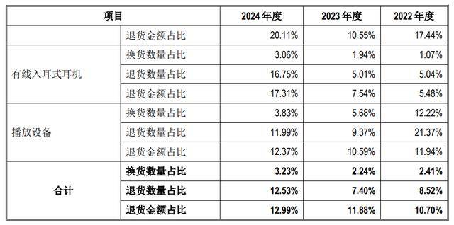 此前,针对北交所的问询海菲曼解释称,2023年至2024年换货数量占比由2.24%提升至3.23%,退货金额占比由11.88%提升至12.99%,占比小幅提高,但退货数量占比由7.40%提升至12.53%,占比提升较多,主要系真无线耳机、有线入耳式的退货数量占比增加所致。